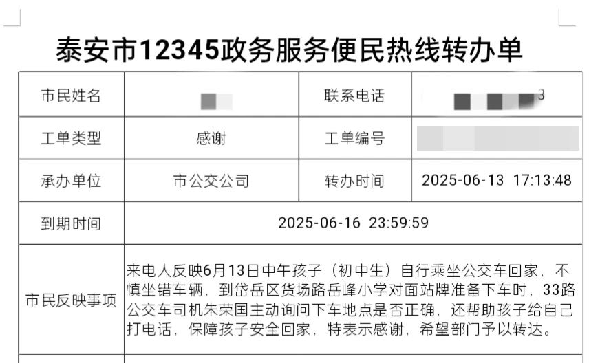 “多虧了33路公交車司機朱榮國師傅,我家孩子才能平安回家!”近日,泰安市12345政務(wù)服務(wù)便民熱線接到一通特殊的感謝來電,市民深情講述了33路公交駕駛員暖心幫助坐錯車女孩平安回家的故事,字里行間滿是感激。